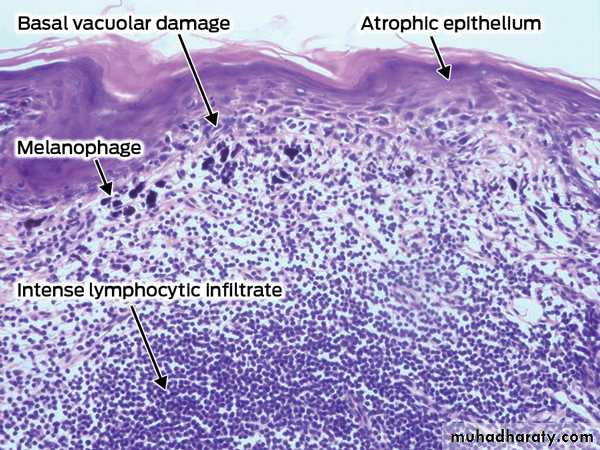 Colloid bodies (damaged keratinocytes)Vacuolar changes in basal layer