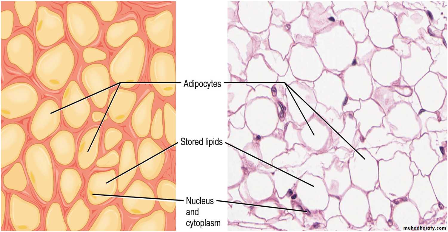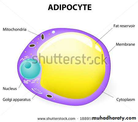 • White adipose tissue: comprises up to 20% of total body weight in normal well-nourished male adults and up to 25% in females. It is distributed throughout the body particularly in the deep layer of the skin.• being an important energy store