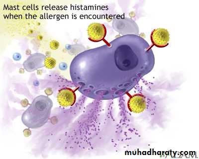 4-Mast cells usually closed associated with blood vessels are widely distributed in connective tissue of the skin and in digestive and respiratory organs. And it is spherical cell filled with fine, dark- staining granules, that contains mediators such as histamine & heparin .
