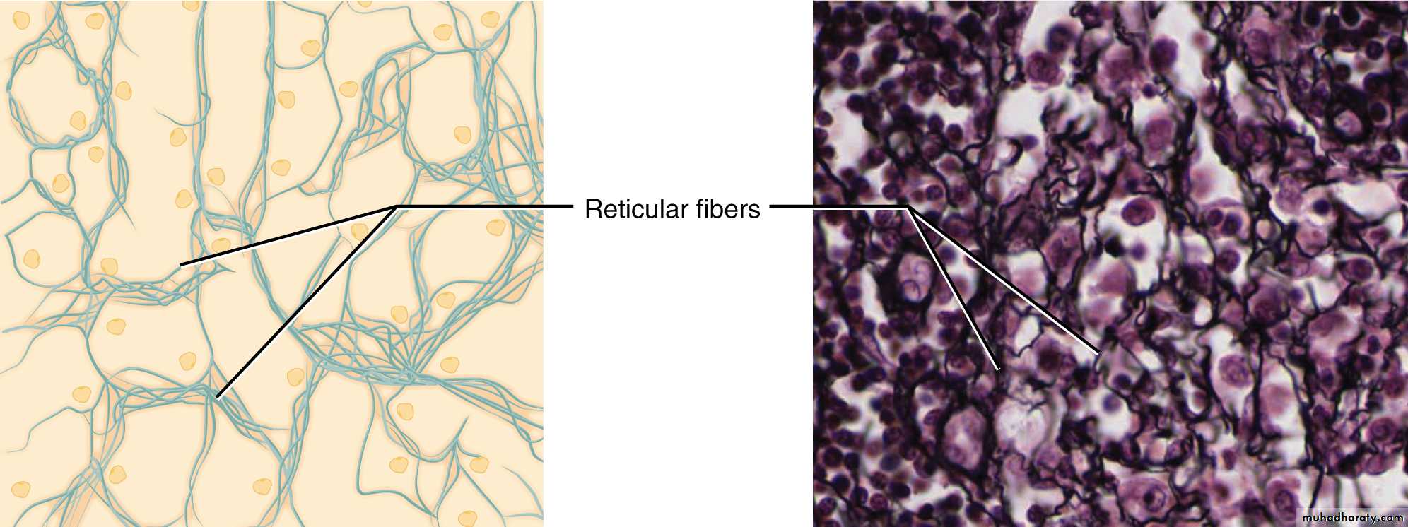 5-Reticular tissue: is a specialized loose connective that provides the architectural framework of bone marrow, liver, spleen, lymph node, smooth muscle and gland and the islets of Langerhans.