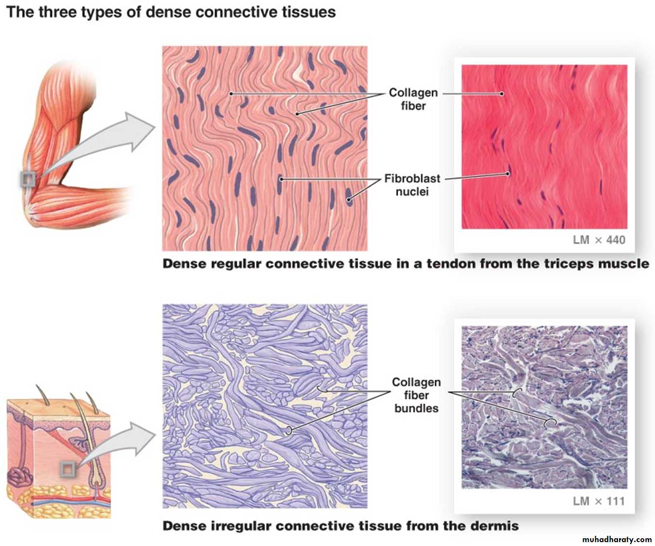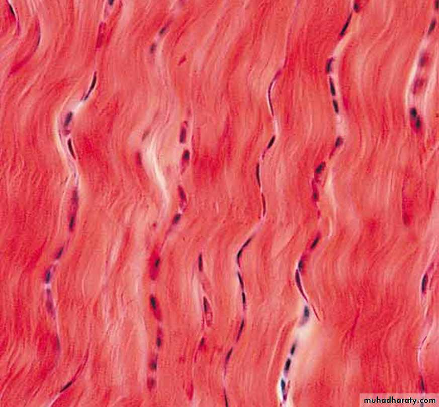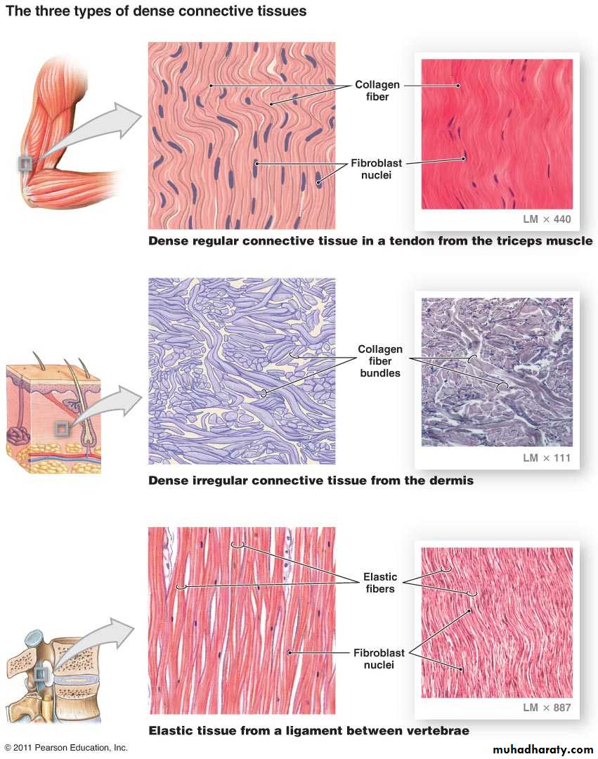 • Regular Dense connective tissue exhibits densely packed collagen fibers with regular and parallel arrangement. This type of tissue is found in the tendons and ligaments Fig (5).