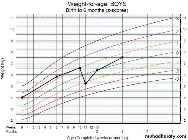 The height and weight should be recorded (and head circumference till 3 years) and plotted on the chart.At all subsequent visits join the dot up to the previous dot.