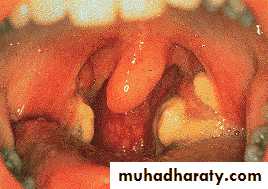 moderate to severe pharyngitis with marked tonsillar enlargement, occasionally with exudates.