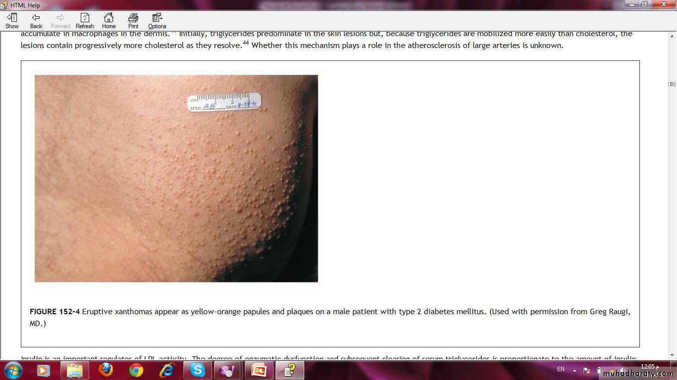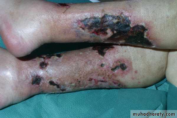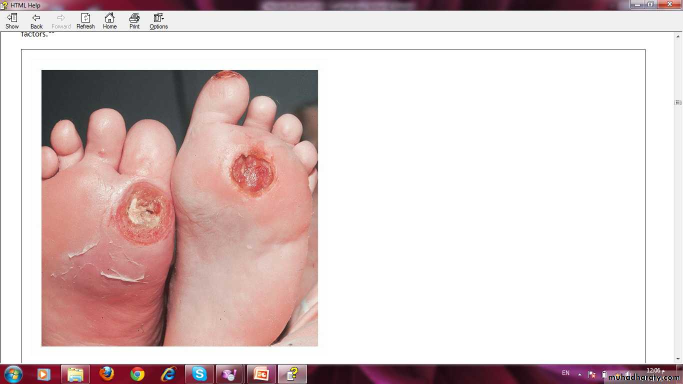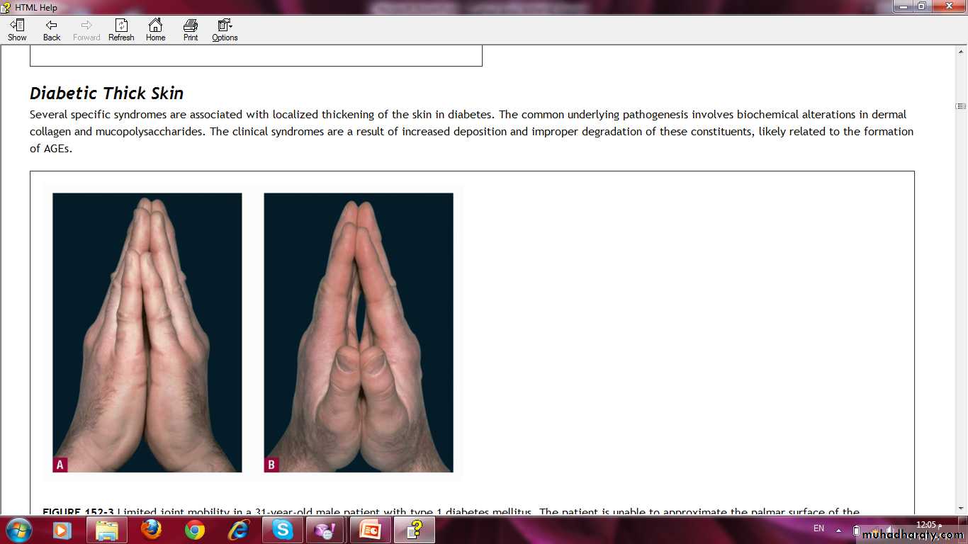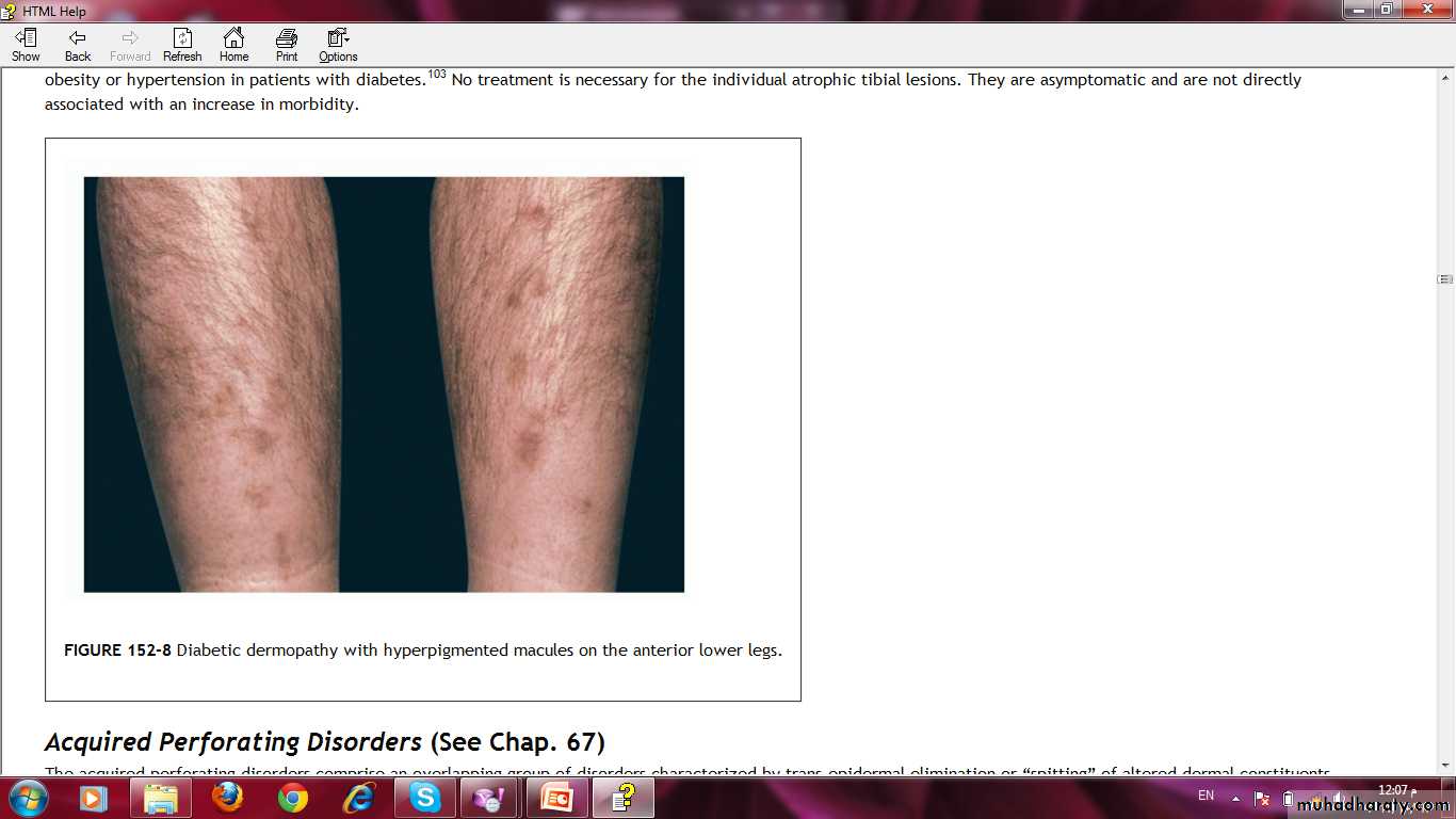 The Skin in Diabetes Mellitus:1- Necrobiosis lipoidica.2- Diabetic dermopathy (shin spots).3- Neuropathic foot ulcers.4- Infections: candidal, staphylococcal, and non clostridial gangrene.5- Diabetic bullae.6- Stiff thick skin (diabetic cheiroarthropathy).7- Carotenodermia (yellow skin).8- Diabetic rubeosis of the face).9- Granuloma annulare.10- Pruritus.11- Eruptive xanthoma.12- Acanthosis nigricans.13- Skin tags.