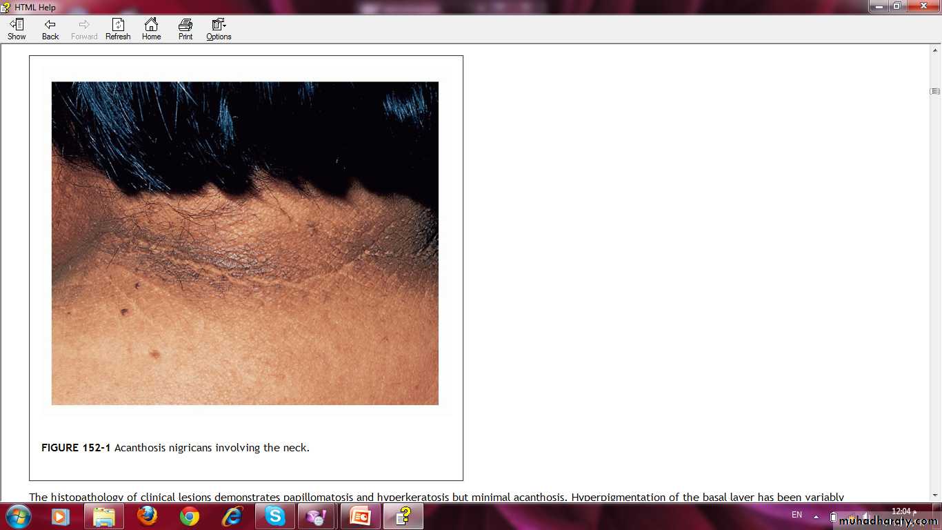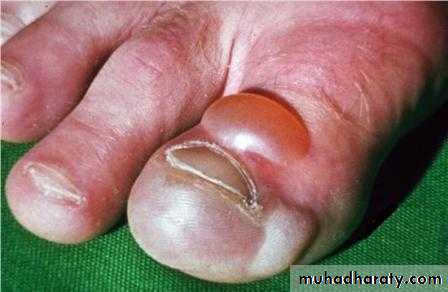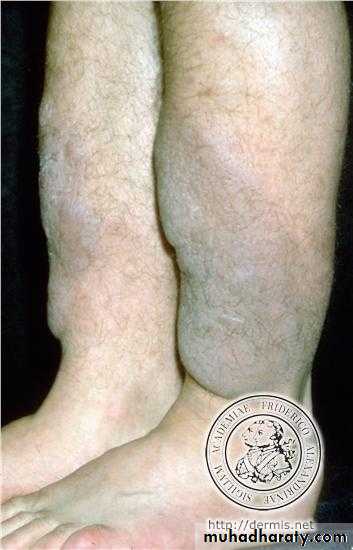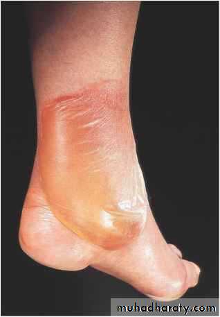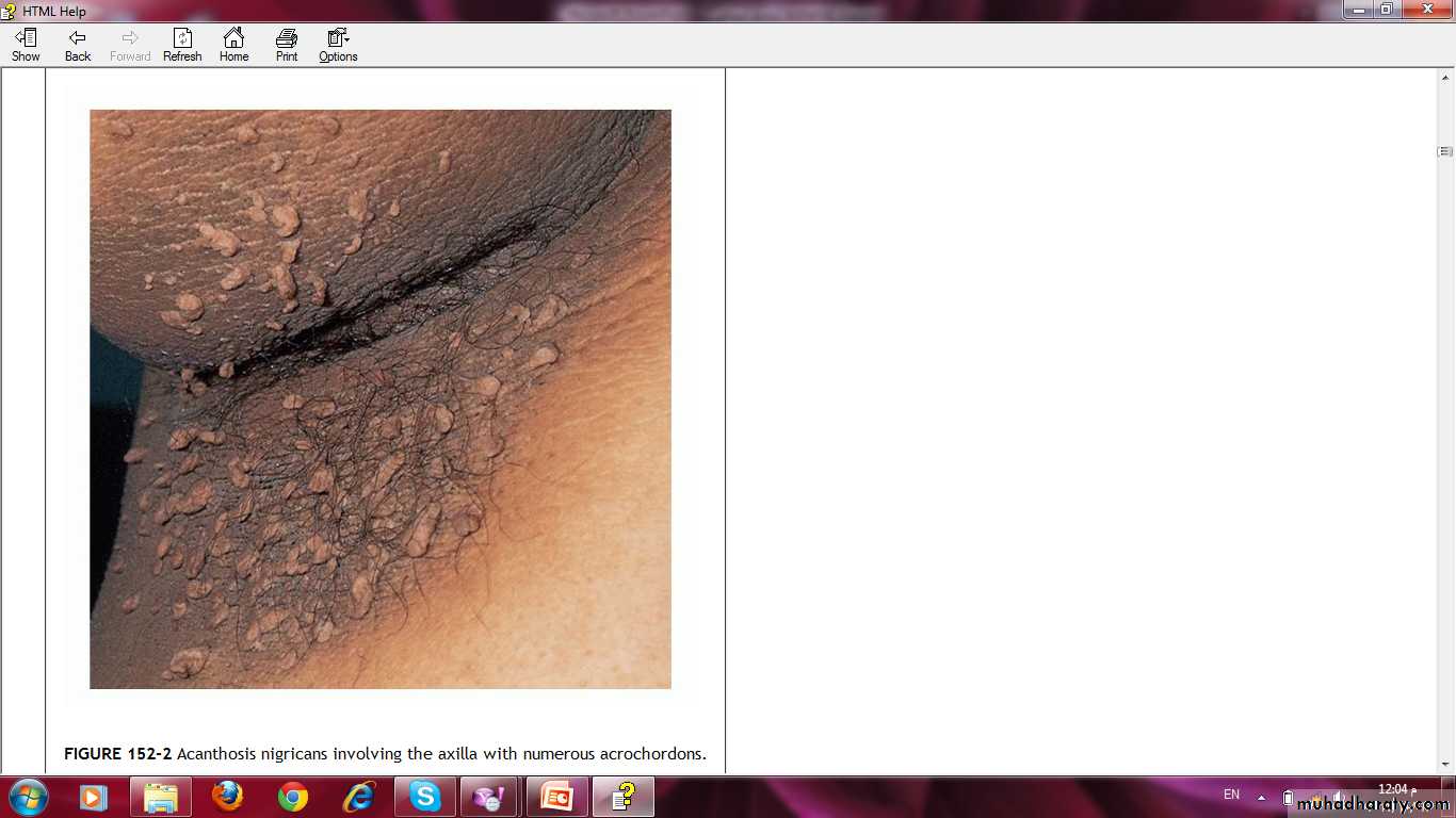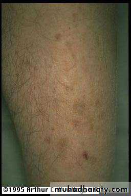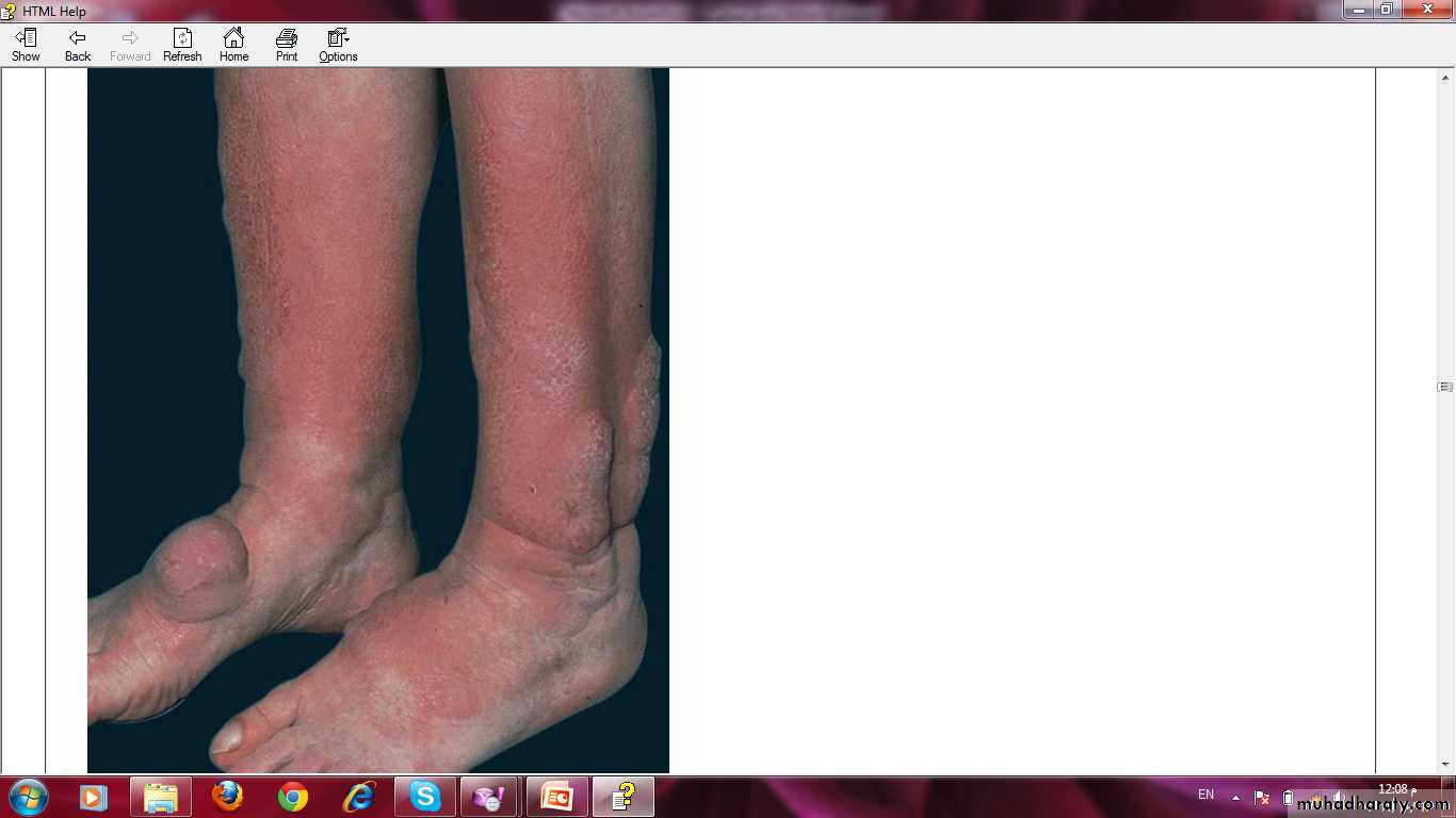 The Skin in Diabetes Mellitus:1- Necrobiosis lipoidica.2- Diabetic dermopathy (shin spots).3- Neuropathic foot ulcers.4- Infections: candidal, staphylococcal, and non clostridial gangrene.5- Diabetic bullae.6- Stiff thick skin (diabetic cheiroarthropathy).7- Carotenodermia (yellow skin).8- Diabetic rubeosis of the face).9- Granuloma annulare.10- Pruritus.11- Eruptive xanthoma.12- Acanthosis nigricans.13- Skin tags.