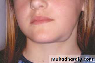 Soft, fluctuant painless double shaped swelling in submandibular or submental region of the neck.
