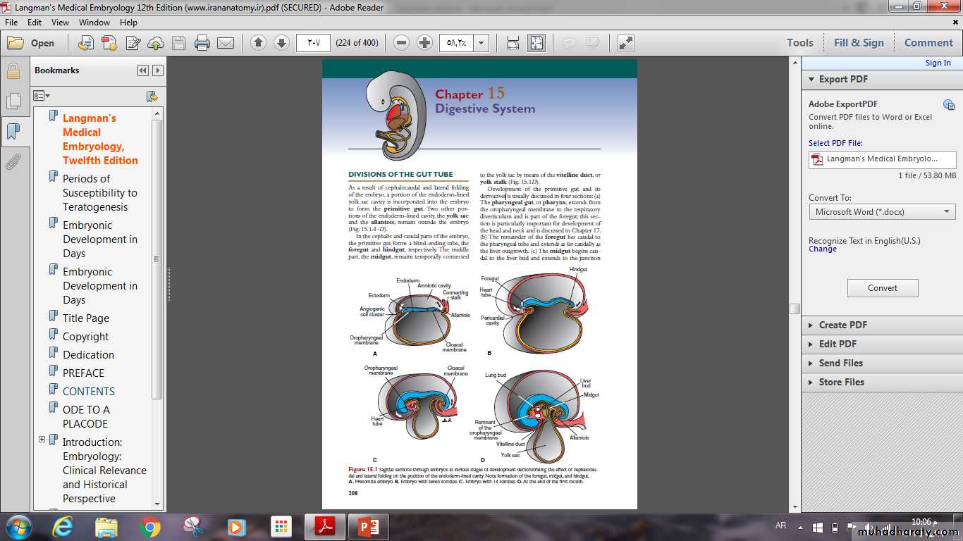 The foregut gives rise to the esophagus, trachea and lung buds, the stomach, and the duodenum .In addition, the liver, pancreas, and biliary apparatus.