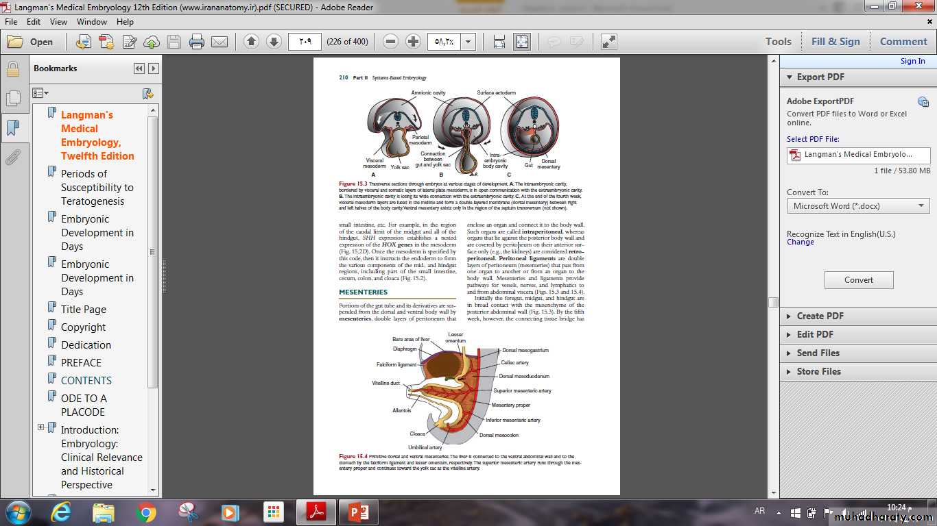Portions of the gut tube and its derivatives are suspended enclose an organ and connect it to the body wall from the dorsal and ventral body wall by mesenteries, double layers of peritoneum that enclose an organ and connect it to the body wall. Such organs are called intra peritoneal, whereas organs that lie against the posterior body wall and are covered by peritoneum on their anterior surface only (e.g., the kidneys) are considered retroperitoneal.Mesenteries provide pathways for vessels, nerves, and lymphatics to and from abdominal viscera .