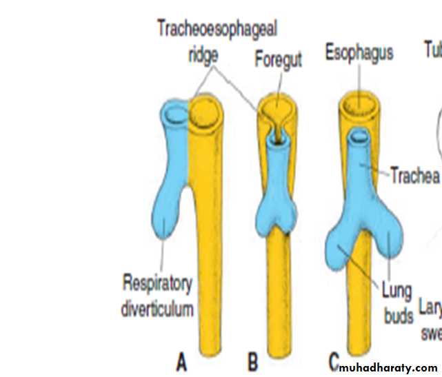 When the embryo is approximately 4 weeks old, the foregut divides into a ventral portion ,the respiratory diverticulum and a dorsal portion ,the esophagus.