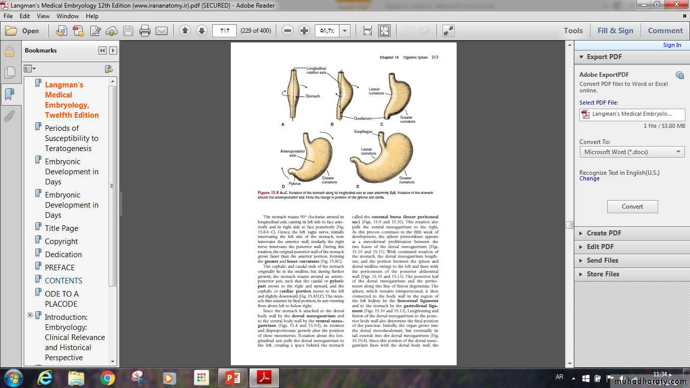 The stomach appears as fusiform dilation of the foregut in the fourth week of development. Positional changes of the stomach are easily explained by assuming that it rotates around a longitudinal and an anteroposterior axis.
