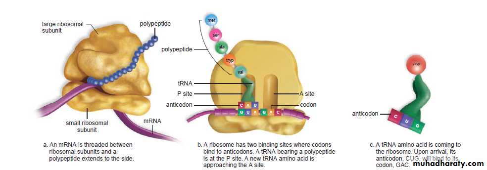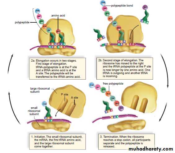 The next stage, which occurs in the cytoplasm is called Translation in which each mRNA molecule becomes attached to one or more ribosomes. the ribosome moves along mRNA from the 5’ to the 3’ and each codon is recognized by a matching complementary tRNA which contributes its amino acid to the end a new growing protein chain until a stop codon is reached. There are three steps:Initiation of translation: small ribosome subunit attaches to the mRNA in the vicinity of the start codon (AUG), then a large ribosomal subunit joins to small subunit. translation begins.