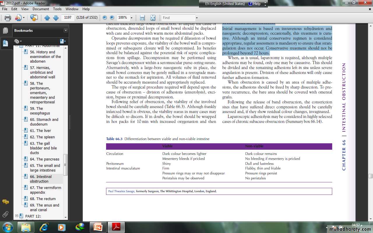 Treatment of adhesionsInitial management is based on intravenous rehydration andnasogastric decompression; occasionally, this treatment is curative.Although an initial conservative regimen is consideredappropriate, regular assessment is mandatory to ensure that strangulation does not occur. Conservative treatment should not be prolonged beyond 72 hours.