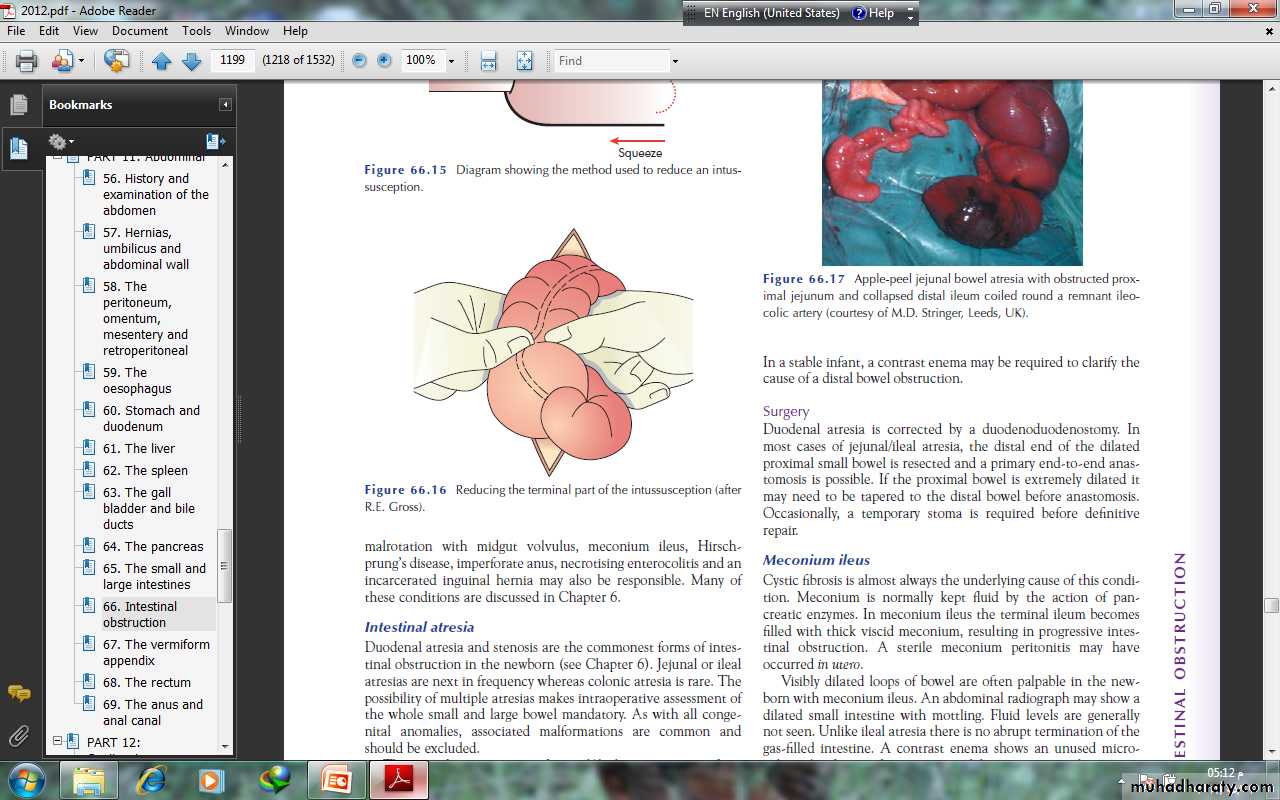 Acute intussusceptionThis occurs when one portion of the gut becomes invaginatedwithin an immediately adjacent segment; almost invariably, it isthe proximal into the distal.The condition is encountered most commonly in children,with a peak incidence between 5 and 10 months of age. About90% of cases are idiopathic but an associated upper respiratorytract infection or gastroenteritis may precede the condition. It isbelieved that hyperplasia of Peyer’s patches in the terminal ileummay be the initiating event. Weaning, loss of passively acquired maternal immunity and common viral pathogens have all beenimplicated in the pathogenesis of intussusception in infancy.