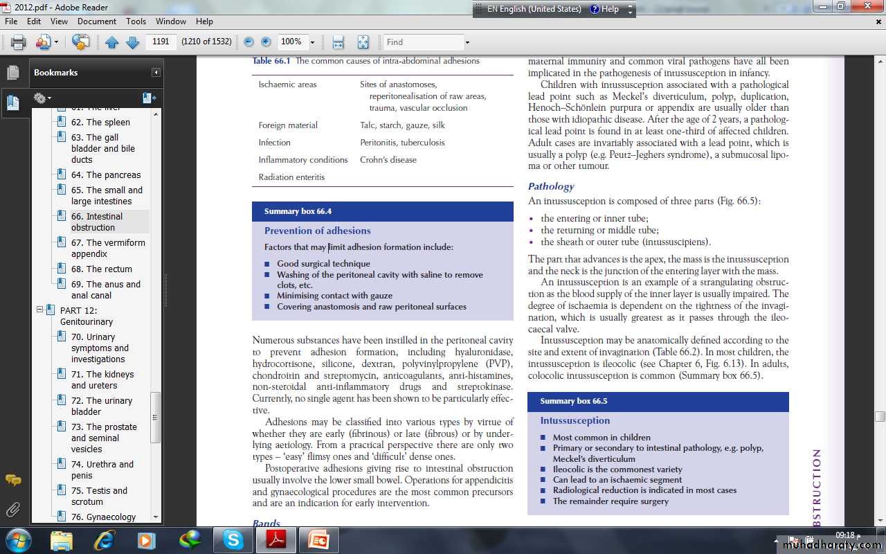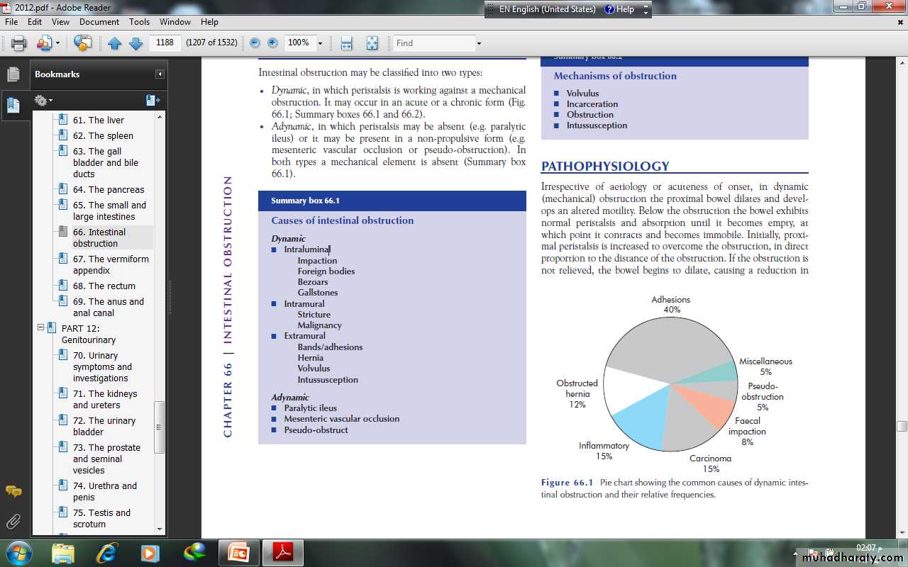 ADYNAMIC OBSTRUCTIONParalytic ileusThis may be defined as a state in which there is failure of transmission of peristaltic waves secondary to neuromuscular failure [i.e. in the myenteric (Auerbach’s) and submucous (Meissner’s) plexuses]. The resultant stasis leads to accumulation of fluid and gas within the bowel, with associated distension, vomiting, absence of bowel sounds and absolute constipation.