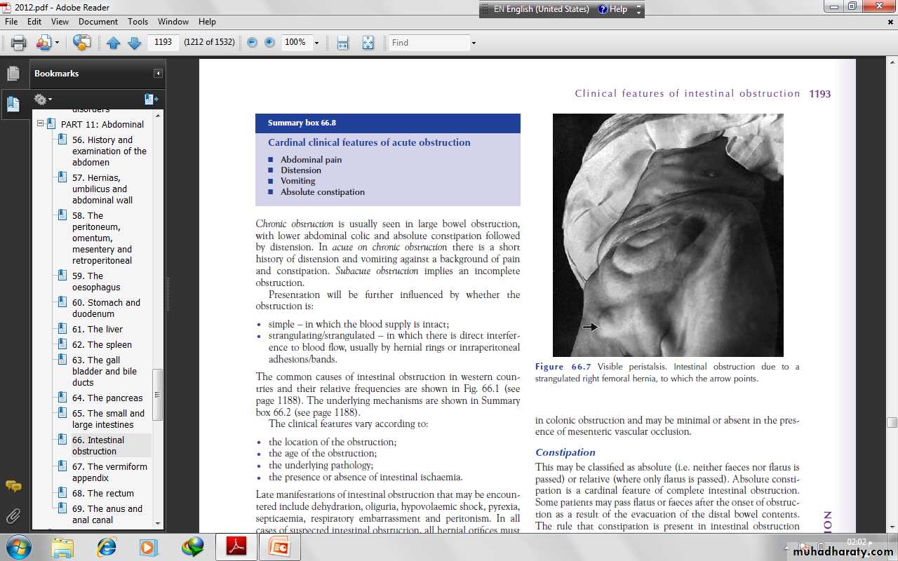 The nature of the presentation will also be influenced by whetherthe obstruction is:• acute;• chronic;• acute on chronic;• subacute.Acute obstruction usually occurs in small bowel obstruction, withsudden onset of severe colicky central abdominal pain, distensionand early vomiting and constipation