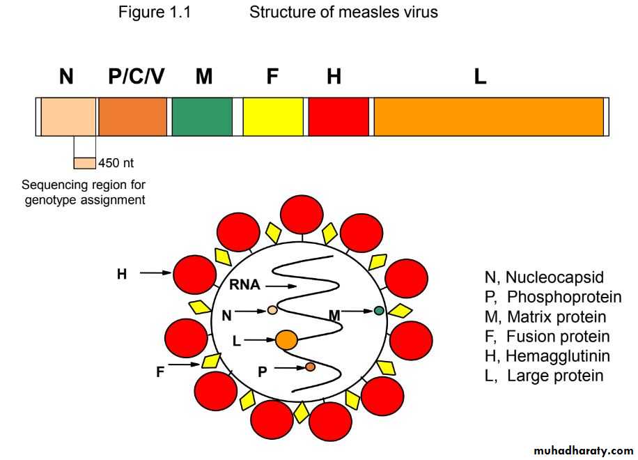 Measles virus is spherical, but is often pleomorphic, measuring 120–250 nm in diameter. It contains a negative-sense RNA genome. The helical nucleocapsid is surrounded by an envelope carrying H and F proteins on its surface.Viral replication