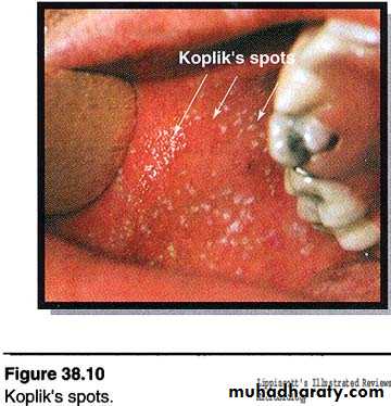Incubation period varies from 8 to 12 days. Measles is a highly contagious febrile illness. The prodromal phase is characterized by high fever, malaise, anorexia, conjunctivitis, cough, and coryza. Koplik’s spot is the typical pathogenic lesion found in the mucous membrane. These are bluish gray grain substance on a red base, which usually appear on the buccal mucosa opposite the second molar. are pathognomonic of measles. Their presence establishes the diagnosis of measles.Boy with Measles