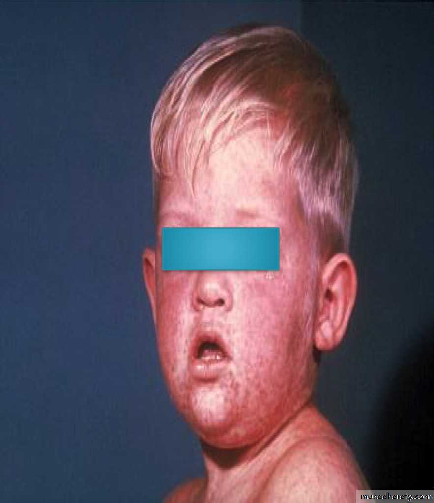 An erythematous maculopapular rash appears within 12–24 hours of appearance of the Koplik’s spots. The rash usually begins on the face, then spreads extensively and appears on the trunk, extremities, palms, and soles and lasts for about 5 days.Desquamation of the rashes except those of palms and soles may occur after 1 week.
