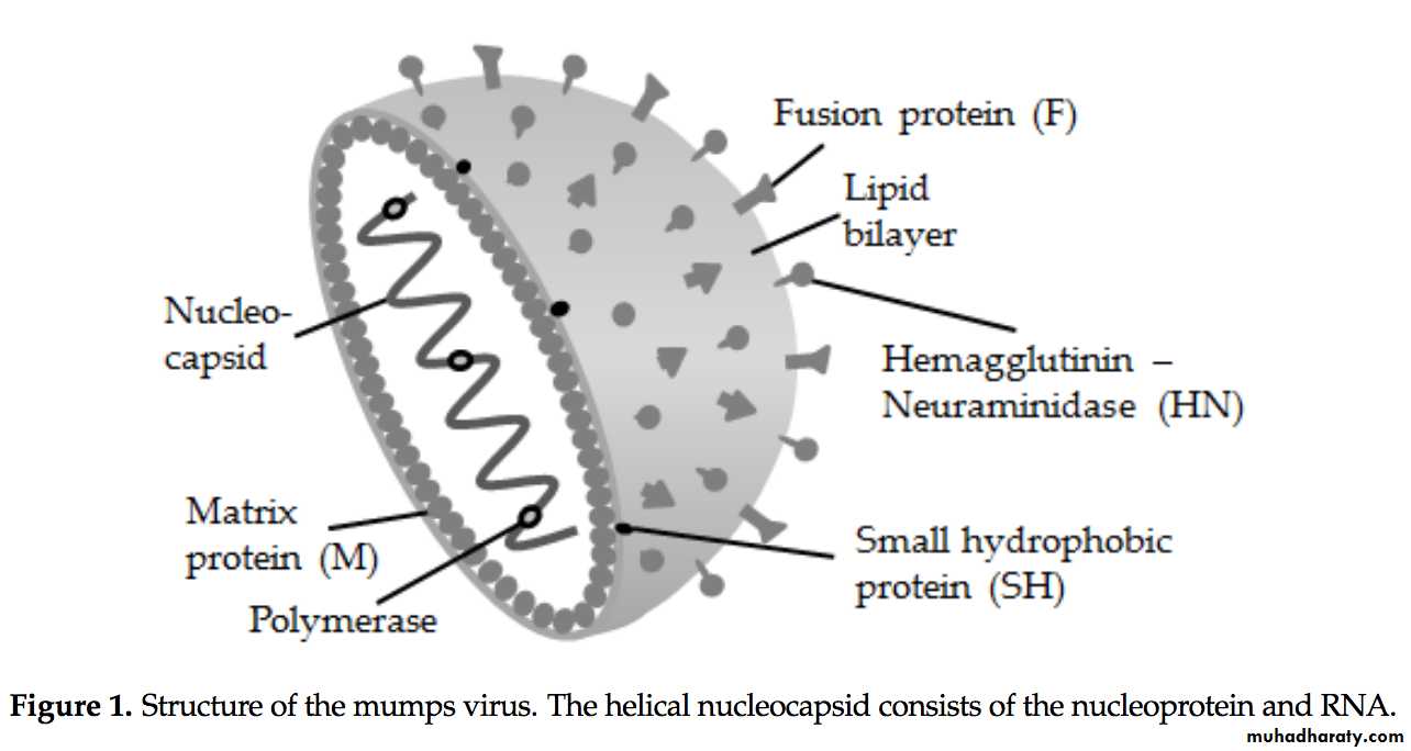 Mumps virus is a typical paramyxovirus containing a single stranded, negative-sense RNA surrounded by an envelope.It has two major surface glycoproteins: