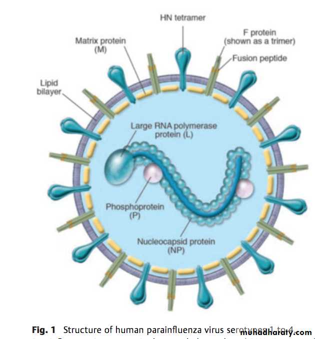 Parainfluenza viruses are pleomorphic viruses measuring 150–200 nm in diameter.The virus contains a single-stranded, nonsegmented, negative- sense RNA genome with nucleoproteins P and L. It is surrounded by a helical nucleocapsid, which contains glycoprotein spikes.