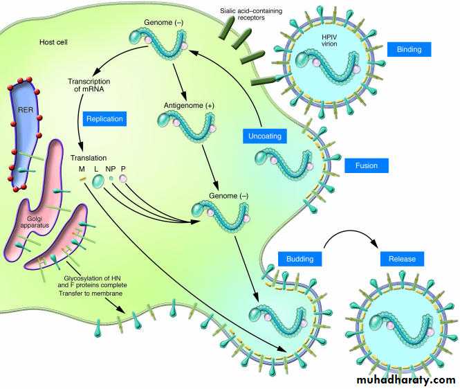 The virus adsorbs to the respiratory epithelial cells by specifically combining with neuraminic acid receptors in the cell through its hemagglutinin. Subsequently, the virus enters the cells following fusion with the cell membrane, mediated by F1 and F2 receptors. The virus replicates rapidly in the cell cytoplasm and causes formation of multinucleated giant cells. The virus also causes the formation of single and multilocular cytoplasmic vacuoles and basophilic or eosinophilic inclusions.The virus causes inflammation of the respiratory tract, leading to secretions of high level of inflammatory cytokines, usually 7–10 days after initial exposure. Airways inflammation, necrosis, and sloughing of respiratory epithelium, edema, and excessive mucus production are the noted pathological features associated with HPIV infections.