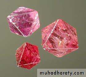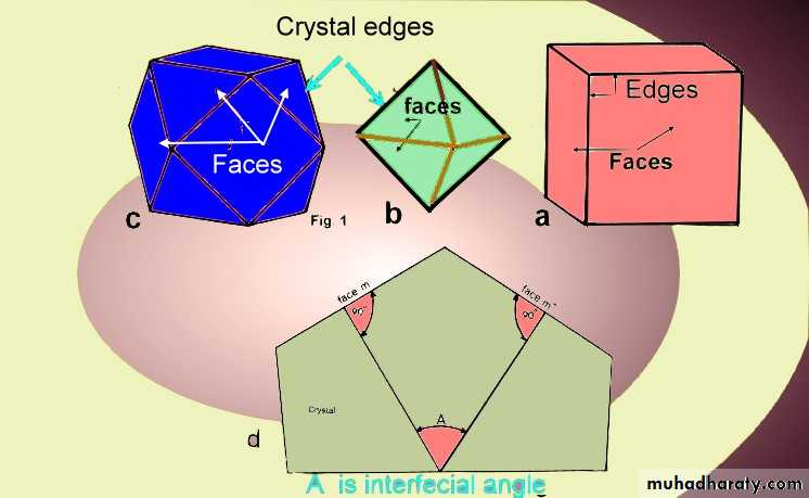 • crystal parts are divided in to two groups:first Real Parts. 1- Crystal Faces : The Plane surface that are the more obvious feature of crystals are parallel to net planes in crystal-structure, faces are two kinds, like and unlike. Crystals with like faces termed a simple form.A Crystals which are consist of two or more simple forms is called a combination.2- Edge: Line is formed by intersection of any two adjacent faces.3- Solid Angle :Angle is formed by intersection of Three or more faces.4- Interfacial Angle : The angle between two faces of crystal as in fig.