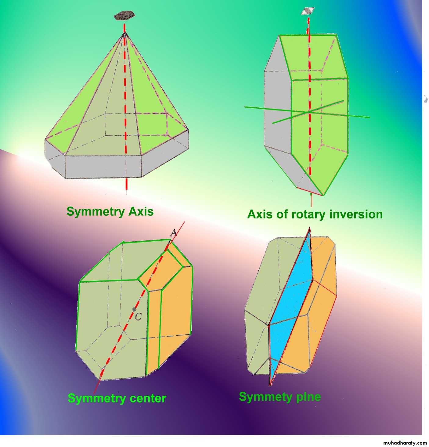2-Symmetry Axis of Rotation : Is an imaginary line through the crystal about which the crystal may rotated and repeat itself in appearance two or more times during a complete rotation.3-symmetry center : If a crystal have center of symmetry , imaginary line can be pass from any point on its surface through its center and similar point at an equal distance is found beyond the center .