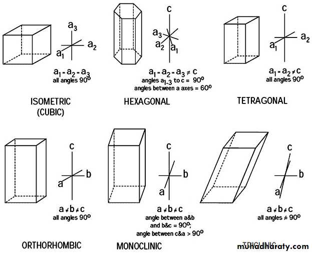 1- Crystallographic axes: Imaginary lines passing through the crystal parallel to intersection of major crystal faces. All the crystals, are referred to three crystallographic axes designated as a , b and c, except of those belonging to hexagonal system is referred to four crystallographic axes.Crystals with three crystallographic axes: