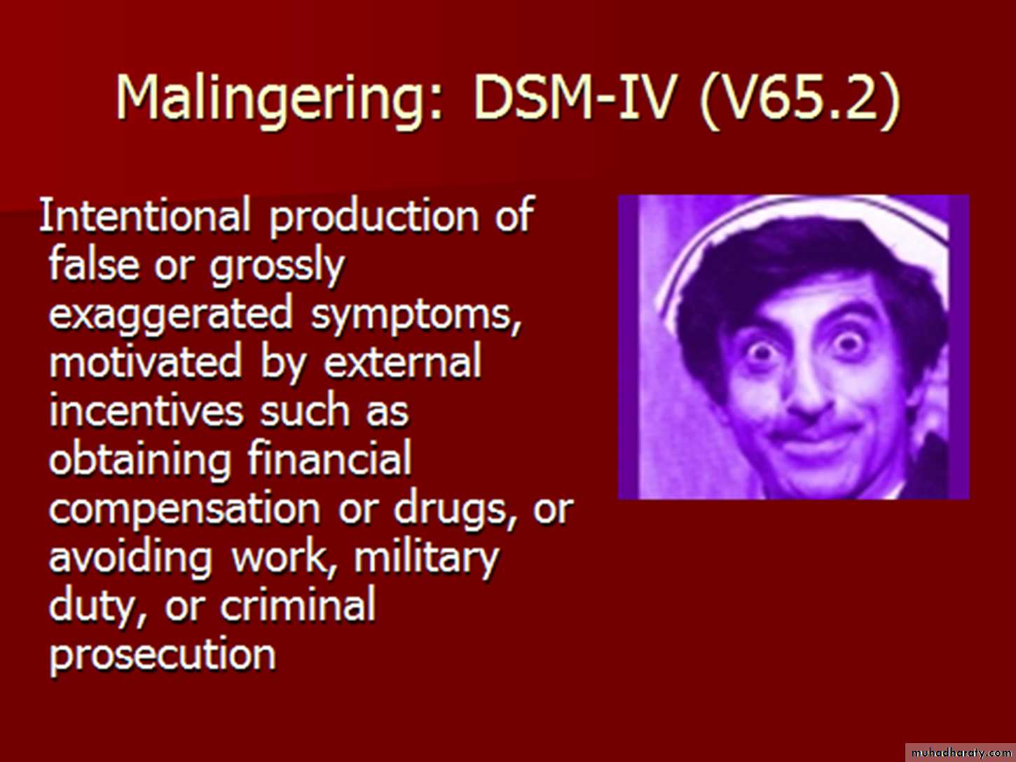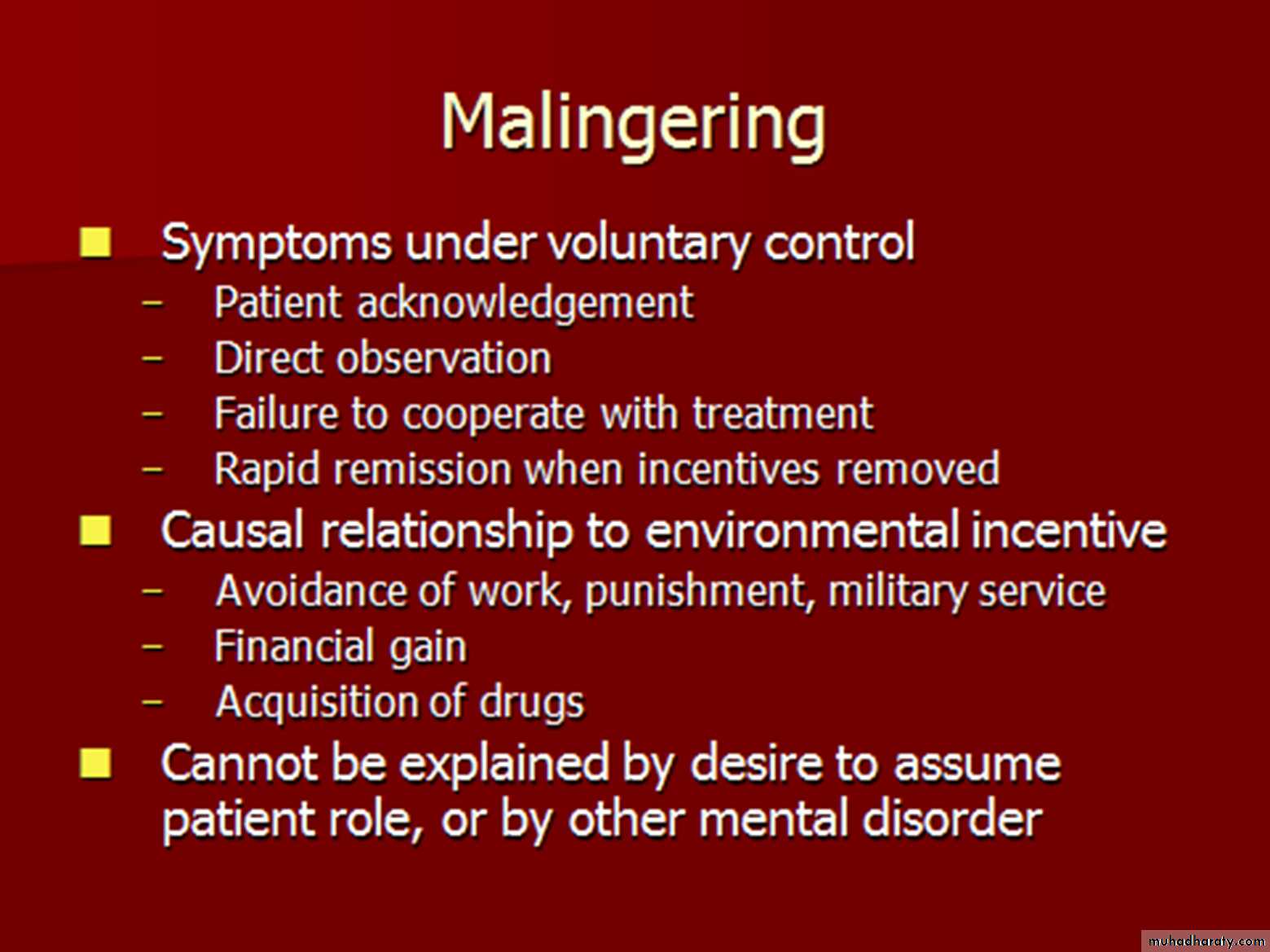 A patient who is malingering takes on physical symptoms for external gain. External gain can be something like money (in the form of disability payments, for example) or something a little more subtle such as avoidance of situations (such as family gatherings)