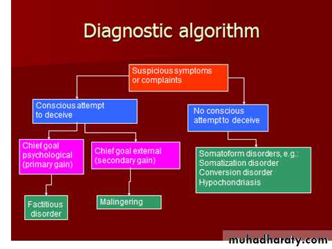 Factitious disorder and malingering must both be ruled out before moving on to a somatoform disorder.A patient with factitious disorder takes on physical symptoms for internal gain. For example, someone who longs for sympathy may exaggerate or feign stomach pain.