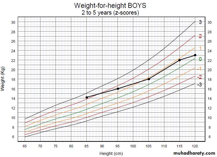weight-for-height at five visits from age 2 to 5 years, the crossing ofz-score lines towards the median and slowing of weight gain represent a good trend.