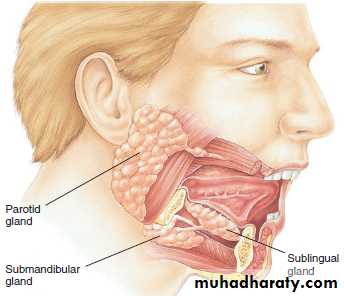The three pairs of salivary glands (SALih-ver-ee) secrete saliva into the mouth.