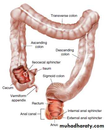 The major parts of the large intestine are the cecum, colon, rectum, and anus