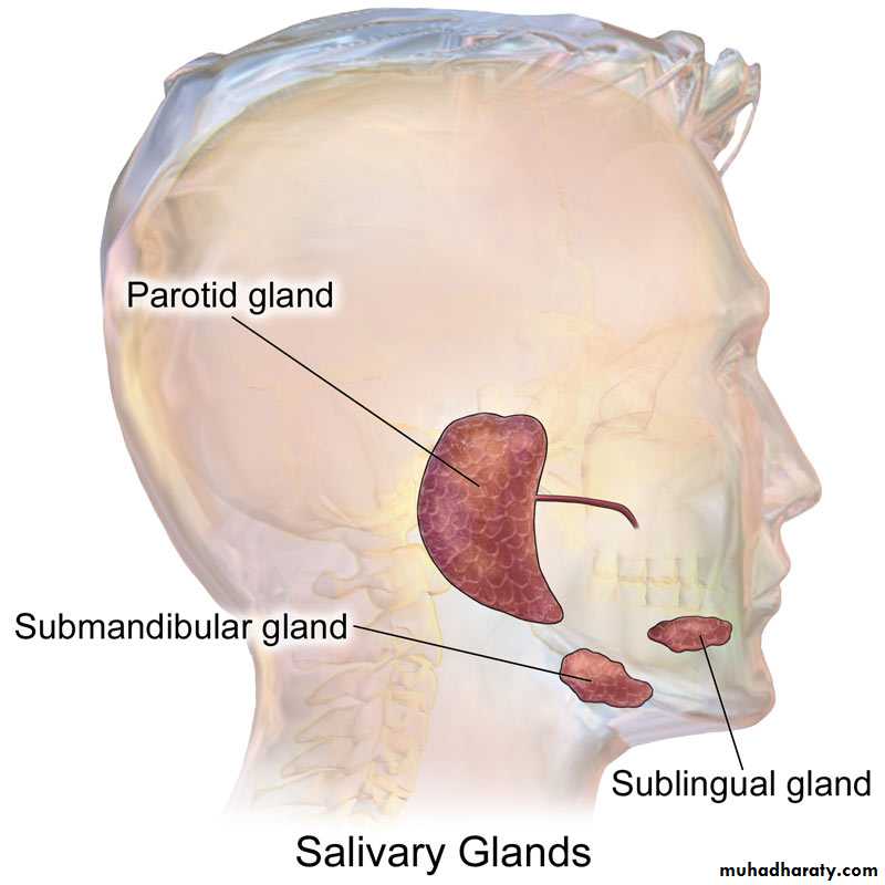 The parotid glands secrete almost entirely the serous type of secretion, whereas the submandibular and sublingual glands secrete both serous secretion and mucus.