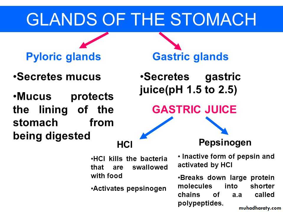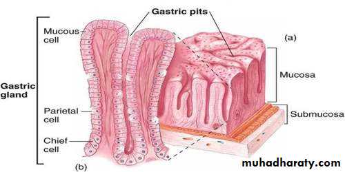 CHARACTERISTICS OF THE GASTRIC SECRETIONSIn addition to mucus-secreting cells that line the entire surface of the stomach, the stomach mucosa has two important types of tubular glands: oxyntic glands (also called gastric glands) and pyloric glands.