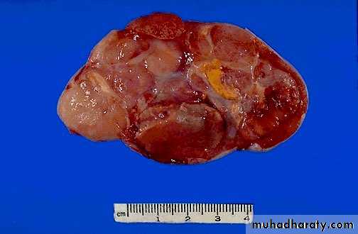 Yolk sac tumor (endodermal sinus tumor) :- most common primary testicular neoplasm in children younger than 3 years of age, but in adult this tumor are mostly seen admix with embryonic carcinoma. Grossly this tumor is typically large and well demarcated.