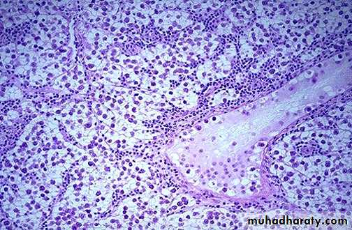 A small rim of remaining normal testis appears at the far right. The tumor is composed of lobulated soft tan to brown tissue.Histologically: solid nest of proliferating tumor cells in between there is randomly scattered thin fibrovascular trabeculea. The tumor cells have well defined borders with clear cytoplasm. The nuclei show limited pleomorphism and coarse granular chromatine. Typically there is lymphocytic infiltration is present in the fibrovascular trabeculea. Radiotherapy results in 5- years’ survival in 85-90%.