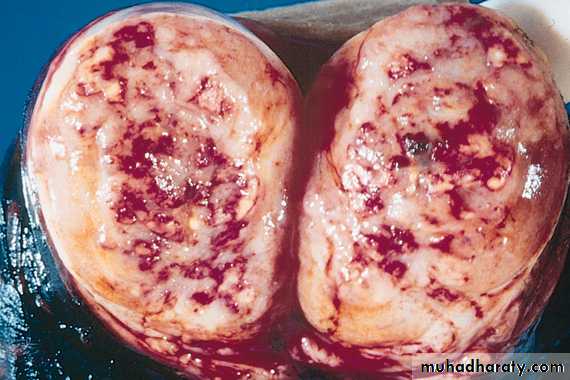 Embryonal carcinoma:- is the second most common testicular germ cell tumor, account 15-35% of these neoplasms. It occurs between 20-35 years. Grossly appear as ill defined invasive masses containing foci of hemorrhage and necrosis. The primary lesion is small even in patient with systemic metastases.