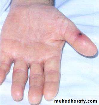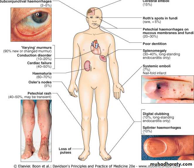 Splinter hemorrhageOsler’s nodes: subcutaneous nodules, tender