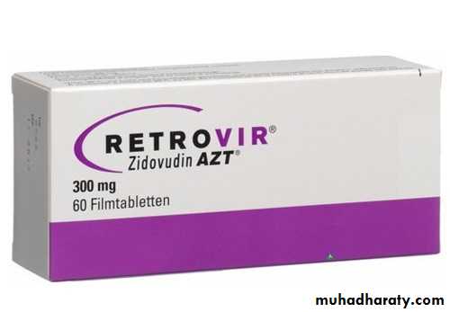 Is the synthetic analog of thymidine. It acts by blocking the synthesis of proviral DNA by inhibiting viral reverse transcriptase. It is widely used for the management of HIV with reduced CD4 T-cell counts (400–500 or less) to prevent progression of the disease.It is also used for treatment of pregnant HIV-infected women. It has been shown to reduce or prevent the transmission of HIV from the mother to the baby.