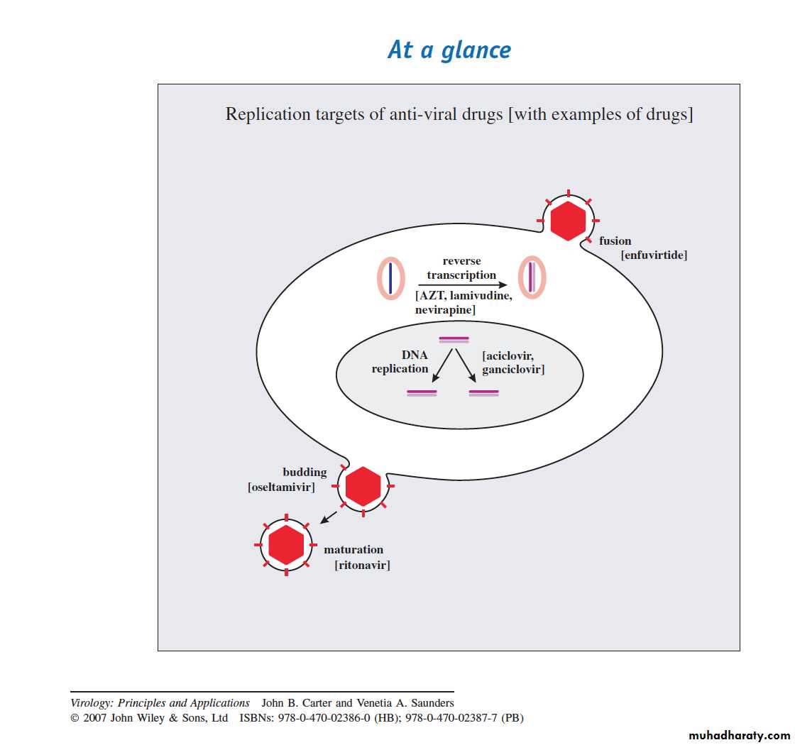 Recently, many antiviral drugs have been developed against viruses that are associated with high morbidity and mortality in humans. These viruses provide potential targets during the cycle of replication for action by antiviral drugs.The viral infection may be inhibited at the level of