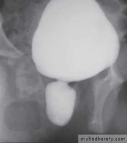 Voiding cystourethrogram :dilated post. Urethra ,valve leaflet , thick Bladder neck