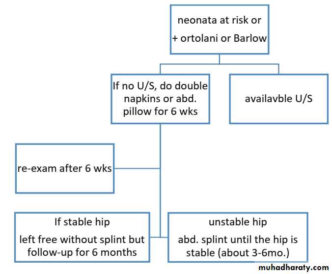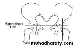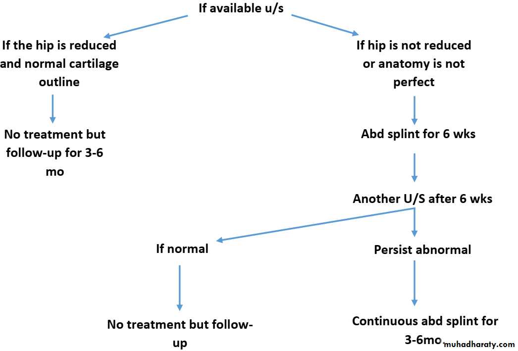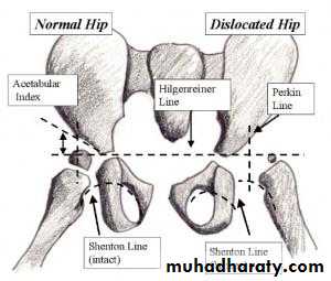 Imaging1. U/S in the neonatal period. Should done for every child at risk and every hip with sign of instability2. X-ray signs In neonate → Von rosens line In infancy → Shentons line Perkins line Acetabular roof angle Smal epiphysis In child hood → false acetabulum3. Arthrography