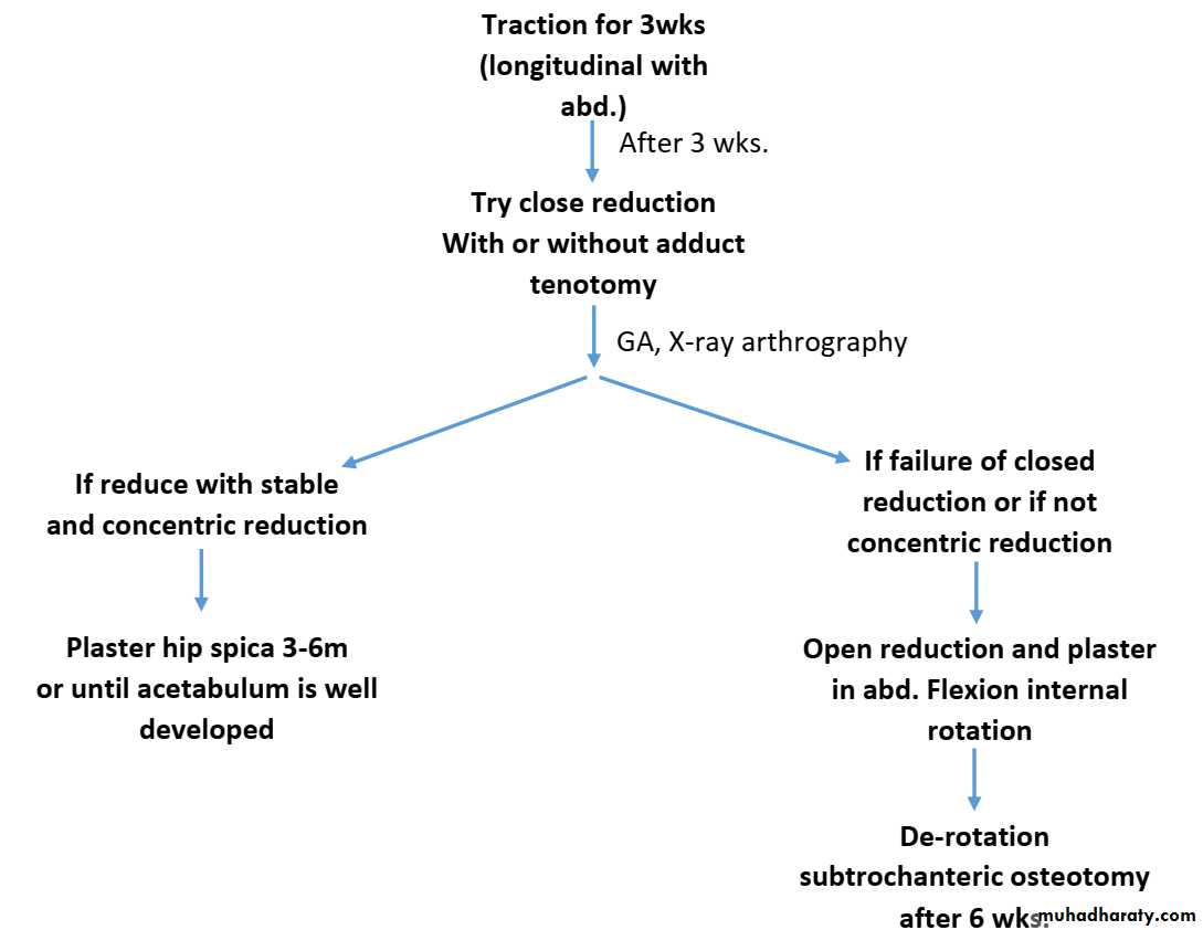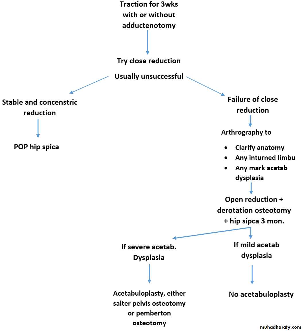 If pt 4-8 y + unilat: OR + derotation osteotomy + acetabuloplasty If pt 4-8 y + bilat: no treatment at this time If pt > 8y: no treatment