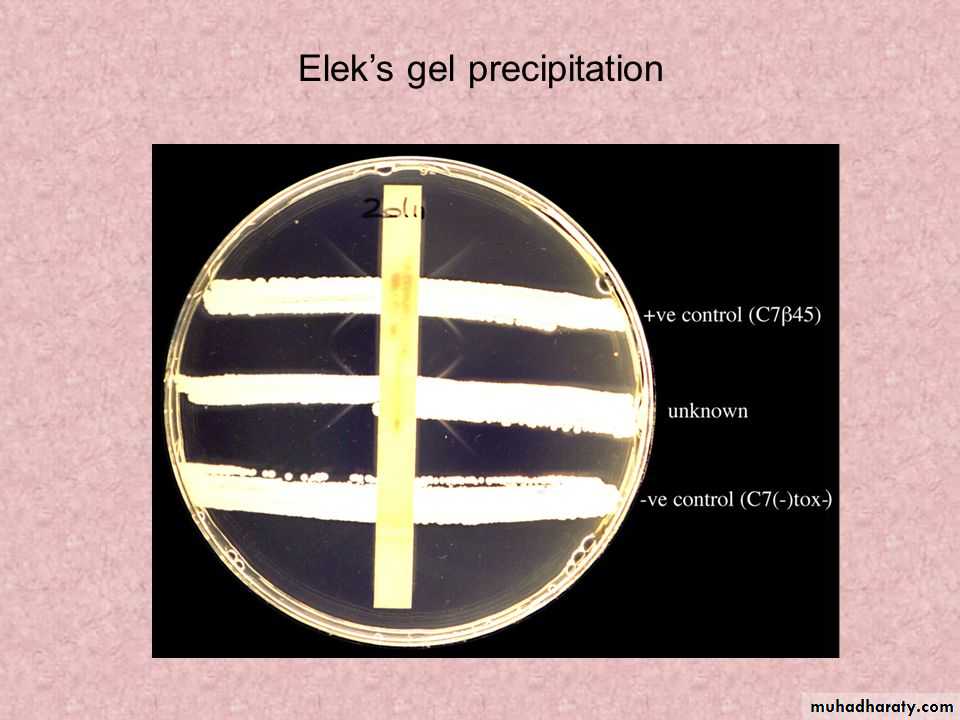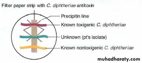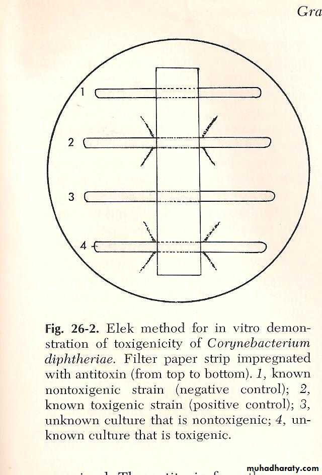 disk has precipitated the toxin diffusing from toxigenic cultures and has resulted in precipitin bands between the disk and the bacterial growth.