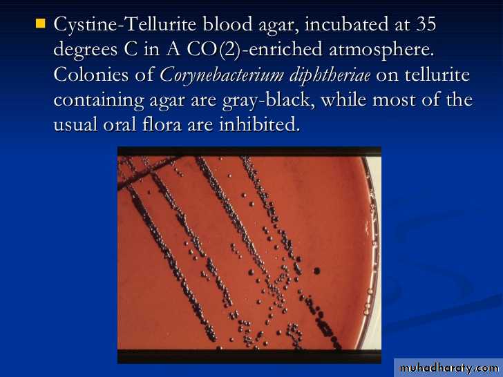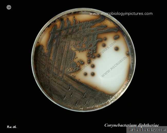 • On agar containing potassium tellurite, the colonies are brown to black with a brown-black halo because the tellurite is reduced intracellularly.