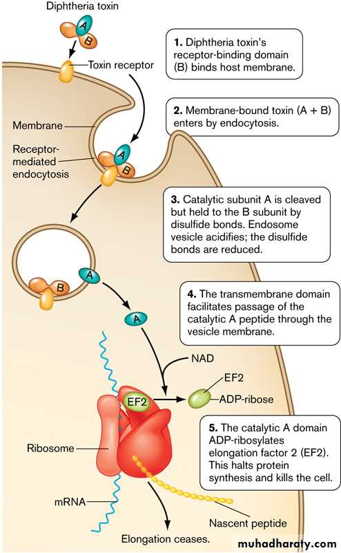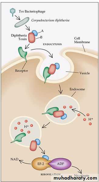 • The diphtheria within the membrane continue to produce toxin actively, toxic damage,