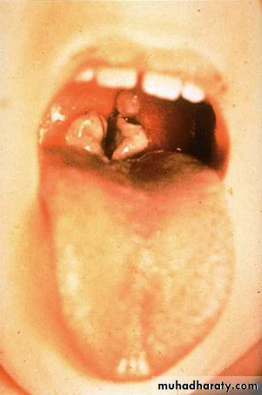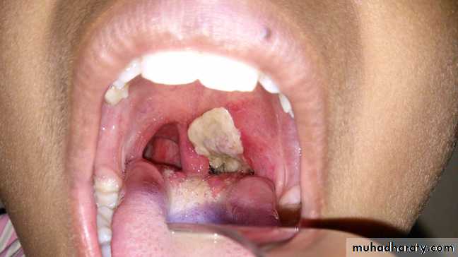 *Diphtheria toxin is absorbed into the mucous membranes and causes destruction of epithelium and a superficial inflammatory response.*The necrotic epithelium becomes embedded in exuding fibrin and red and white cells, so that a grayish “pseudomembrane” is— commonly over the tonsils, pharynx, or larynx.