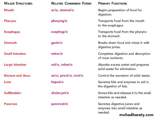 The structures of the digestive system are described asthe gastrointestinal tract or GI tract (gastr/o means stomach, intestine means intestine, and -al means pertaining to).