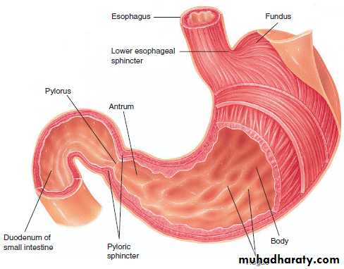 The stomach is a sac-like organ composed of the fundus (upper part), body (main portion), and antrum (lower part).The pylorus (pye-LOR-us)